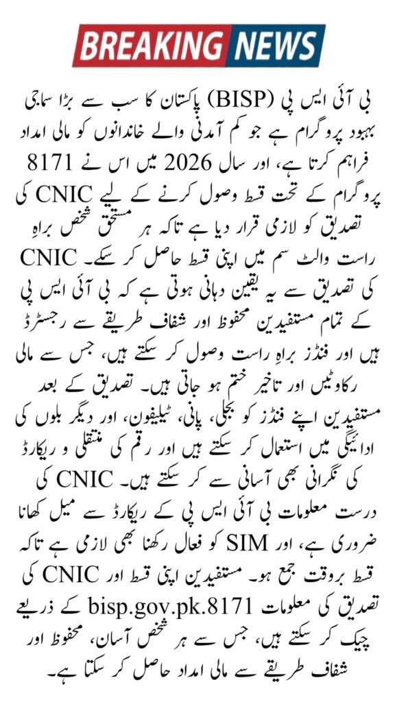 CNIC verification for BISP 8171 is the first step to secure your 2026 installment. Without verification, the wallet SIM cannot be activated, and beneficiaries will face delays in receiving their funds.