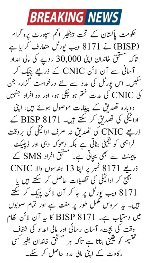 The BISP 8171 Web Portal is a government platform that allows eligible families to check their Rs. 30,000 payments online using their CNIC. This portal reduces delays, prevents fraud, and ensures financial assistance reaches deserving families without visiting BISP offices.