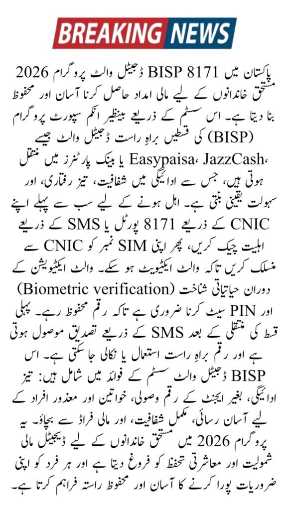 The BISP digital wallet payment system 2026 allows beneficiaries to receive financial assistance directly into a mobile wallet instead of collecting cash from centers. This system is linked with CNIC verification, biometric checks, and the official 8171 portal to ensure only eligible people receive payments. Digital wallets make payments faster, safer, and easier, especially for women and elderly beneficiaries living in remote areas.